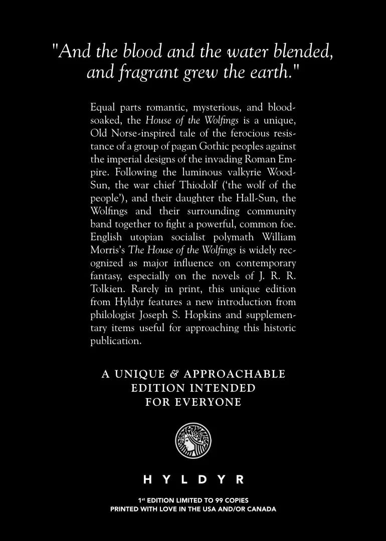 Following the luminous valkyrie Wood-Sun, the war chief Thiodolf (‘the wolf of the people’), and their daughter the Hall-Sun, the Wolfings and their surrounding community band together to fight a powerful, common foe. English utopian socialist polymath William Morris’s "The House of the Wolfings" is widely recognized as major influence on contemporary fantasy, especially on the novels of J. R. R. Tolkien.
